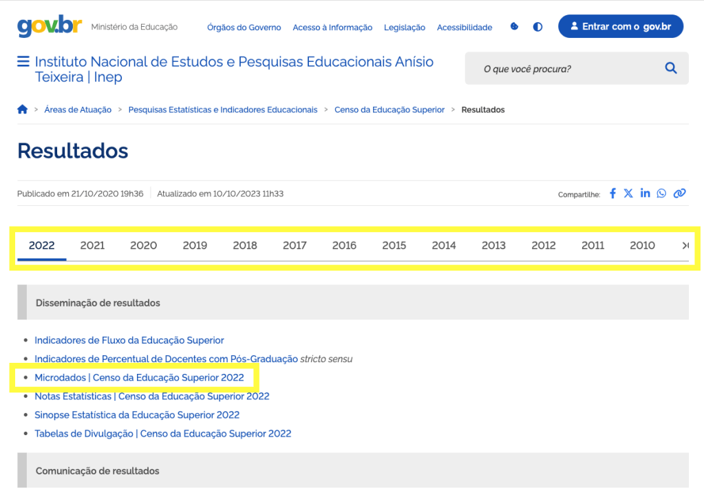 Selecione o ano para o qual deseja acessar os dados e clique Microdados | Censo da Educação Superior YYYY